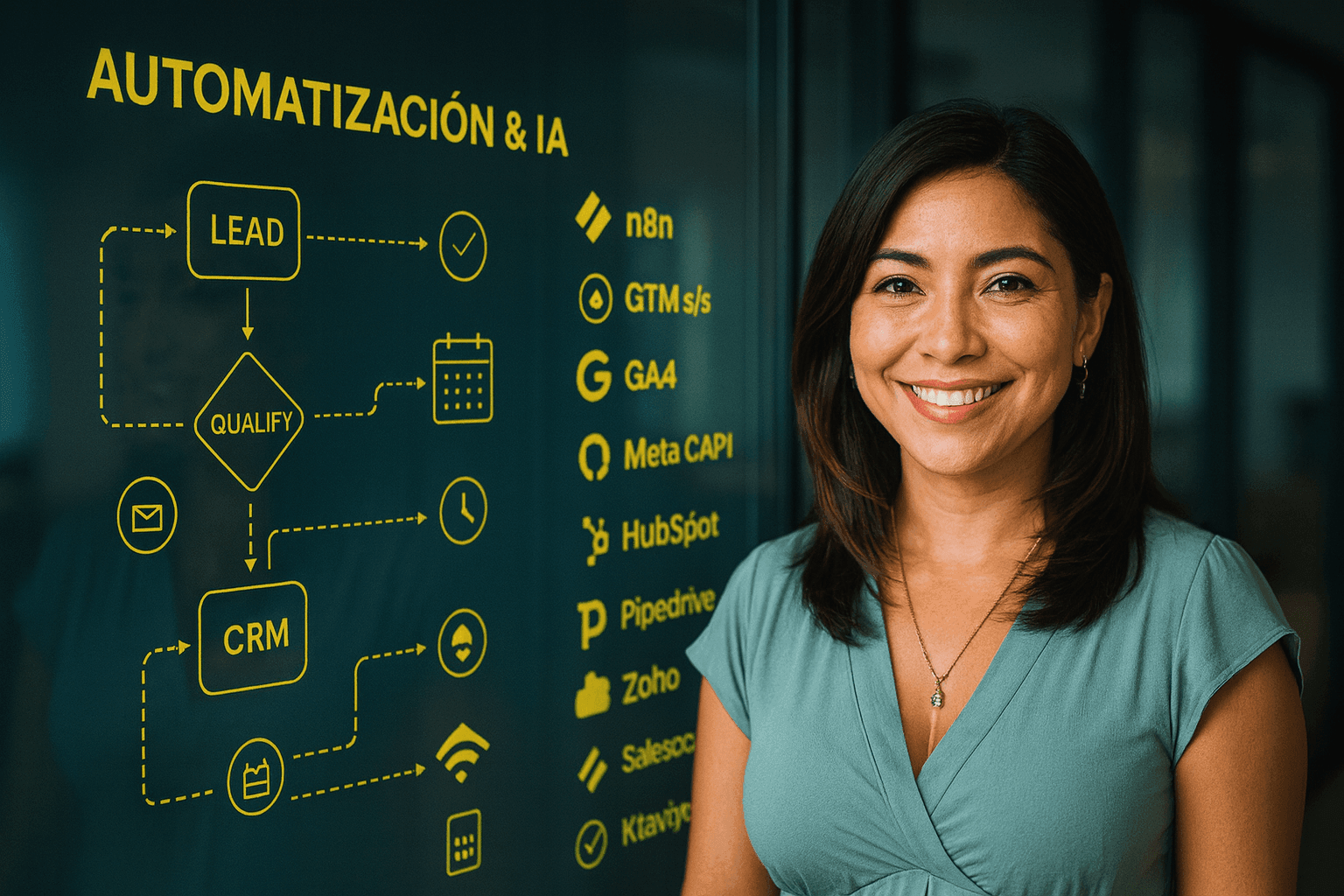 Es la combinación de workflows (reglas, disparadores y conexiones entre herramientas) con modelos de IA que deciden, predicen o redactan en tiempo real. En la práctica: cuando alguien deja un lead, el sistema lo califica, lo enruta al canal correcto (voz/WhatsApp/email), agenda la reunión, registra todo en el CRM, activa seguimiento y mide la conversión con CAPI server-side. Resultado: menos tareas manuales, menos fugas en el embudo y decisiones con datos confiables.