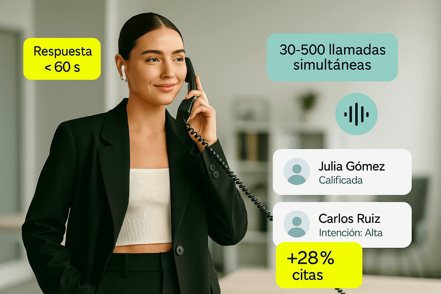- Cualificación inteligente: guiones adaptativos + scoring IA (intención, fit, urgencia).